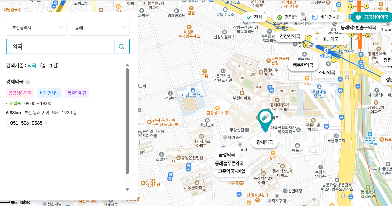 동래구는 병원과 주거지가 밀집된 지역이므로 갑작스러운 상황에 대비해 휴일지킴이약국 실시간 조회와 편의점 상비약 위치를 함께 알아두는 것이 도움이 됩니다.