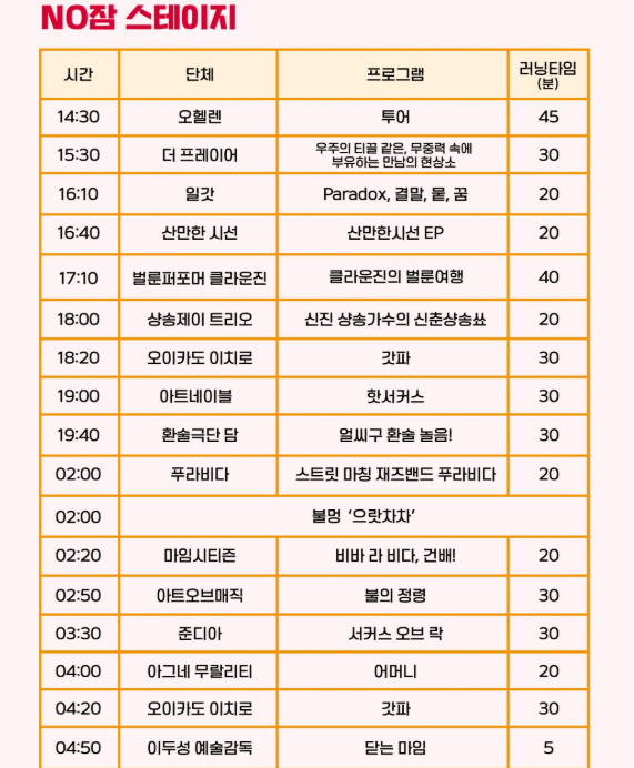 형식: 이동형 거리 퍼포먼스와 고정 무대 공연이 번갈아 펼쳐집니다. 밤새도록 이어지는 다채로운 연출에 푹 빠져보세요.
