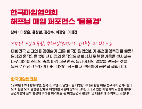 - 관객 참여: 무대로 초청된 관객이 즉석 마임 체험에 참여하며 축제의 주인공이 될 수 있습니다.