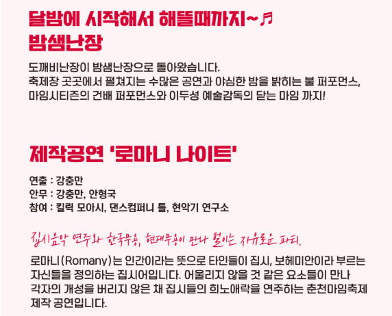 춘천마임축제의 특별 심야 프로그램 ‘도깨비난장’이 2025년 5월 31일 오후 2시부터 다음 날 새벽 5시까지 레고랜드 코리아 리조트 주차장에서 펼쳐집니다. 전통과 현대가 어우러진 마임, 불과 빛, 리듬이 한데 모여 꿈결 같은 시간을 선사합니다.